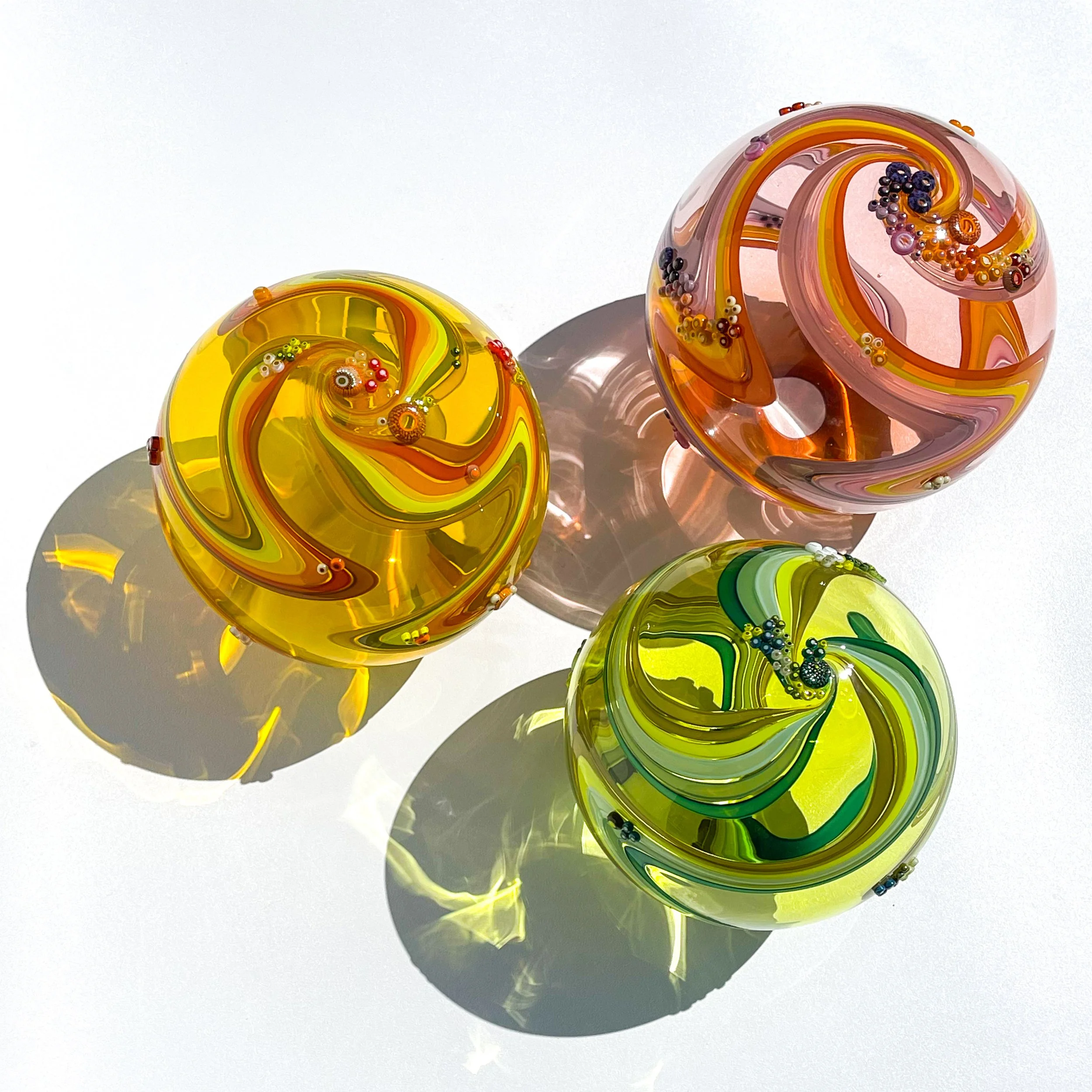 Spring is here and I have been working hard on finishing the projects in my life, something I am horrible at! I love coming up with new ideas and blowing glass but sometimes it’s a struggle to finish those ideas and my studio fills up with half-finished thoughts. The challenge was worth it though! I was really inspired by the Artemis space launch and had it playing in the background the whole time I was in the studio. Because I pushed myself I came up with new work like “Strawberry Moon” and “Artemis” who have both found homes already! I also created a trio of space-age spheres that are a new design path, even adding light to them. They are currently available under Grand Designs!